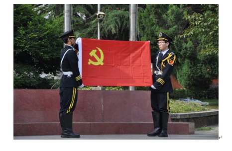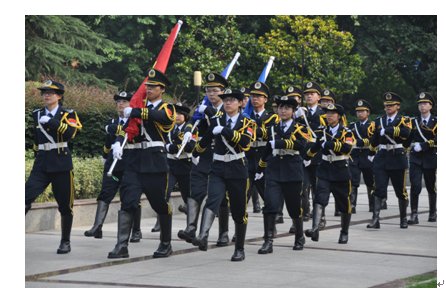 清一色的深蓝色礼服,清一色的亮白色手套,在明快雄壮的乐曲韵律中,旗手和仪仗队精神饱满地迈着坚定的步伐整齐地前进。本次升旗活动的升旗手和仪仗队均由我校优秀青年党员代表担任,代表着中国共产党一批又一批的新生力量。