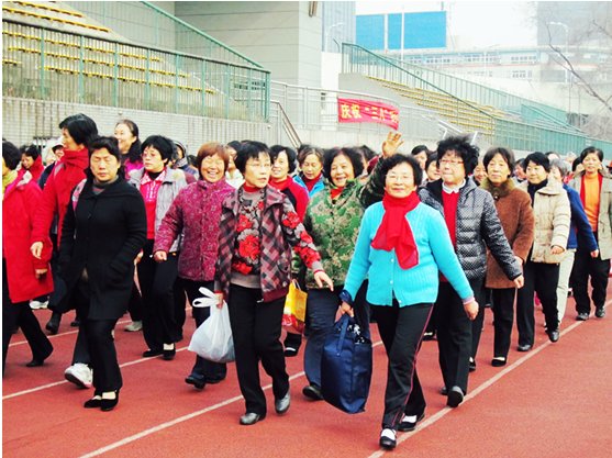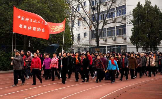 整装待发,气势恢宏。9:00整,随着发令枪响,运动员进行曲奏起,健身走队伍在老年体育协会会旗和“中国科大离退休干部迎新春、庆三八健身走”的横幅引领下,列8个纵队沿操场慢步行进。900余名老同志宛若一条长龙,甚为壮观。