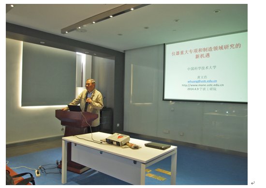 4月9日下午, 中国科学技术大学教授、“973”项目评审专家黄文浩应邀到中国科学院宁波材料技术与工程研究所进行学术交流,并作了题为“重大仪器专项和制造领域的新机遇”的学术报告。宁波材料所所属先进制造所研究员张文武主持报告会,杨桂林研究员、吴爱国研究员等参加了报告会。