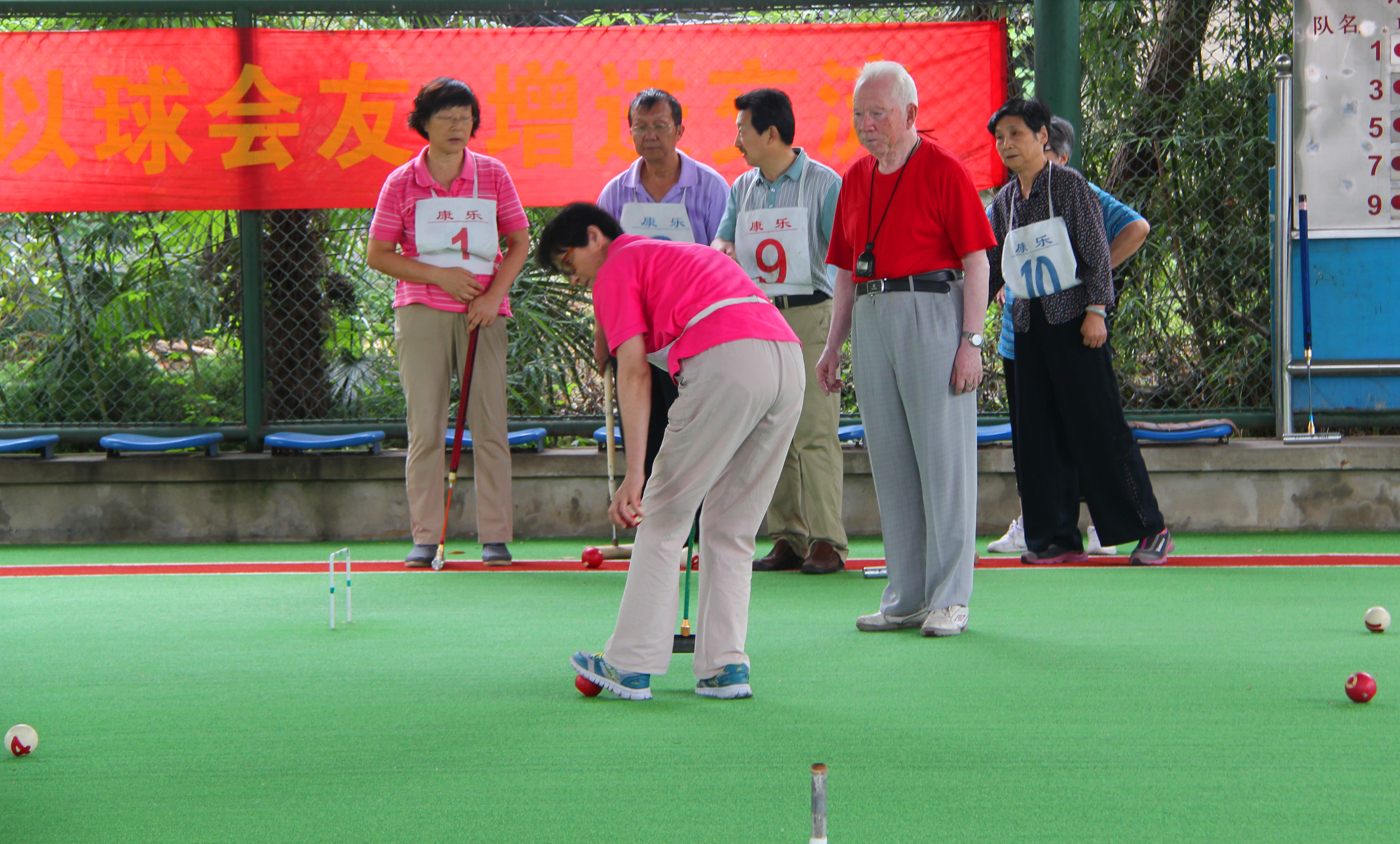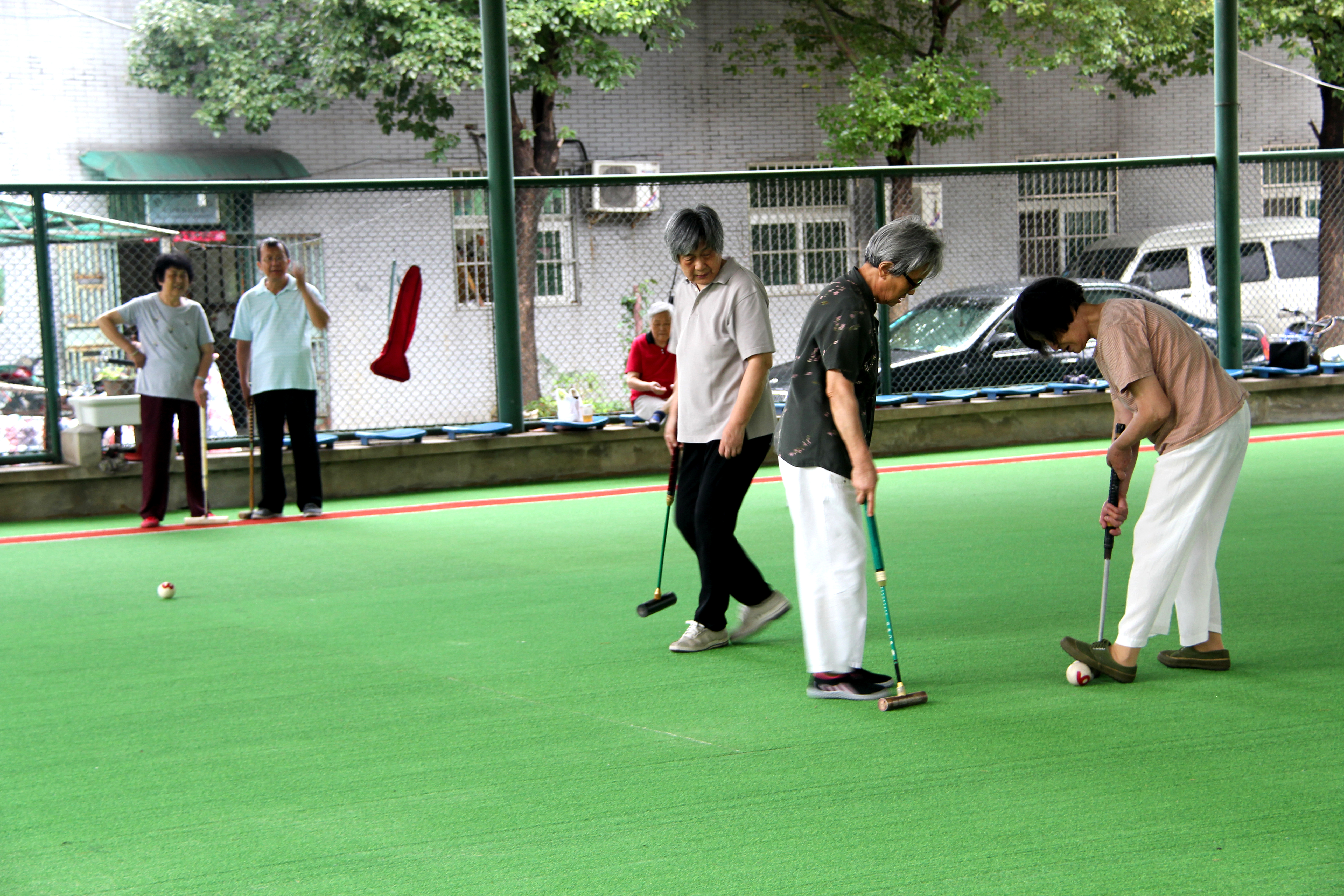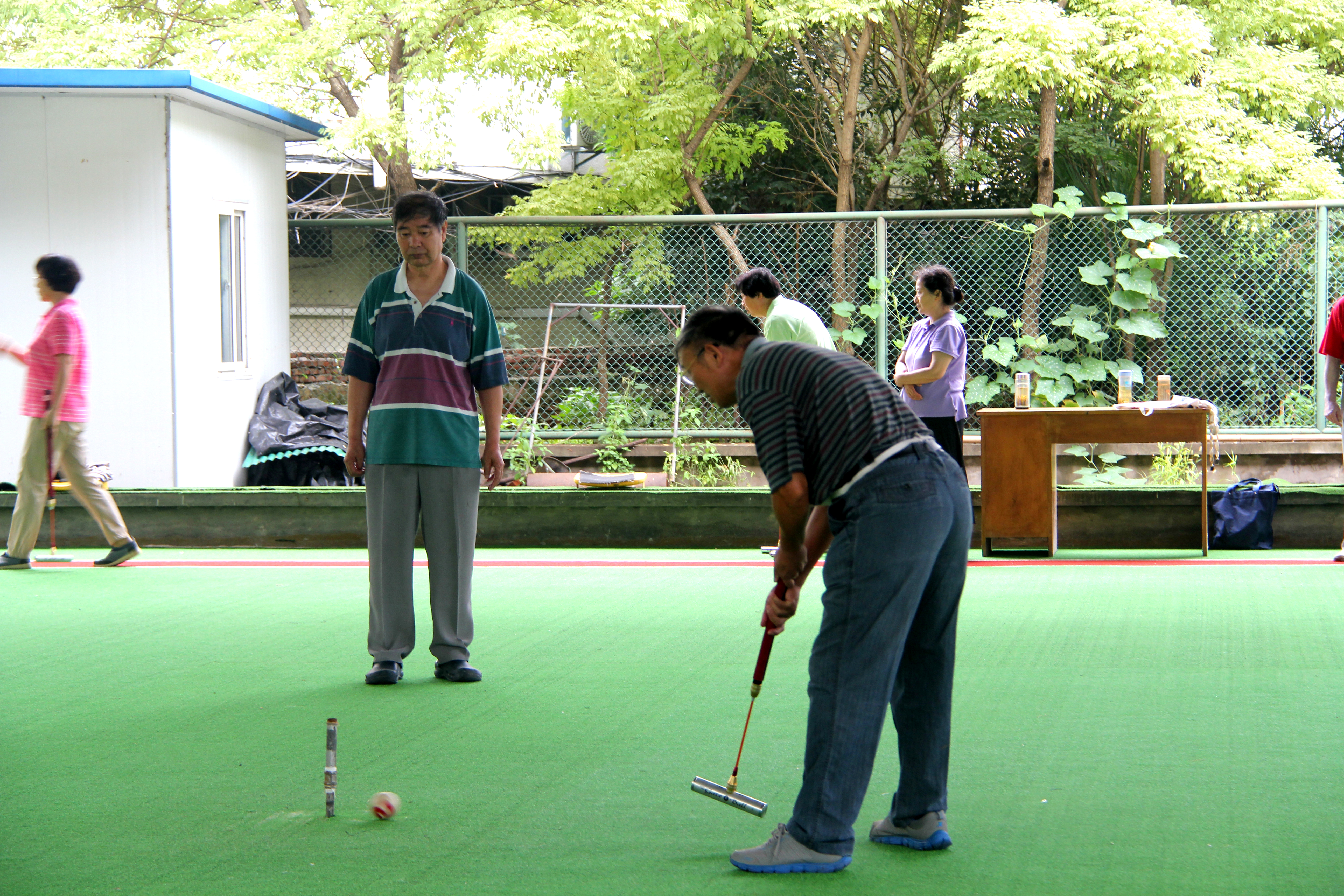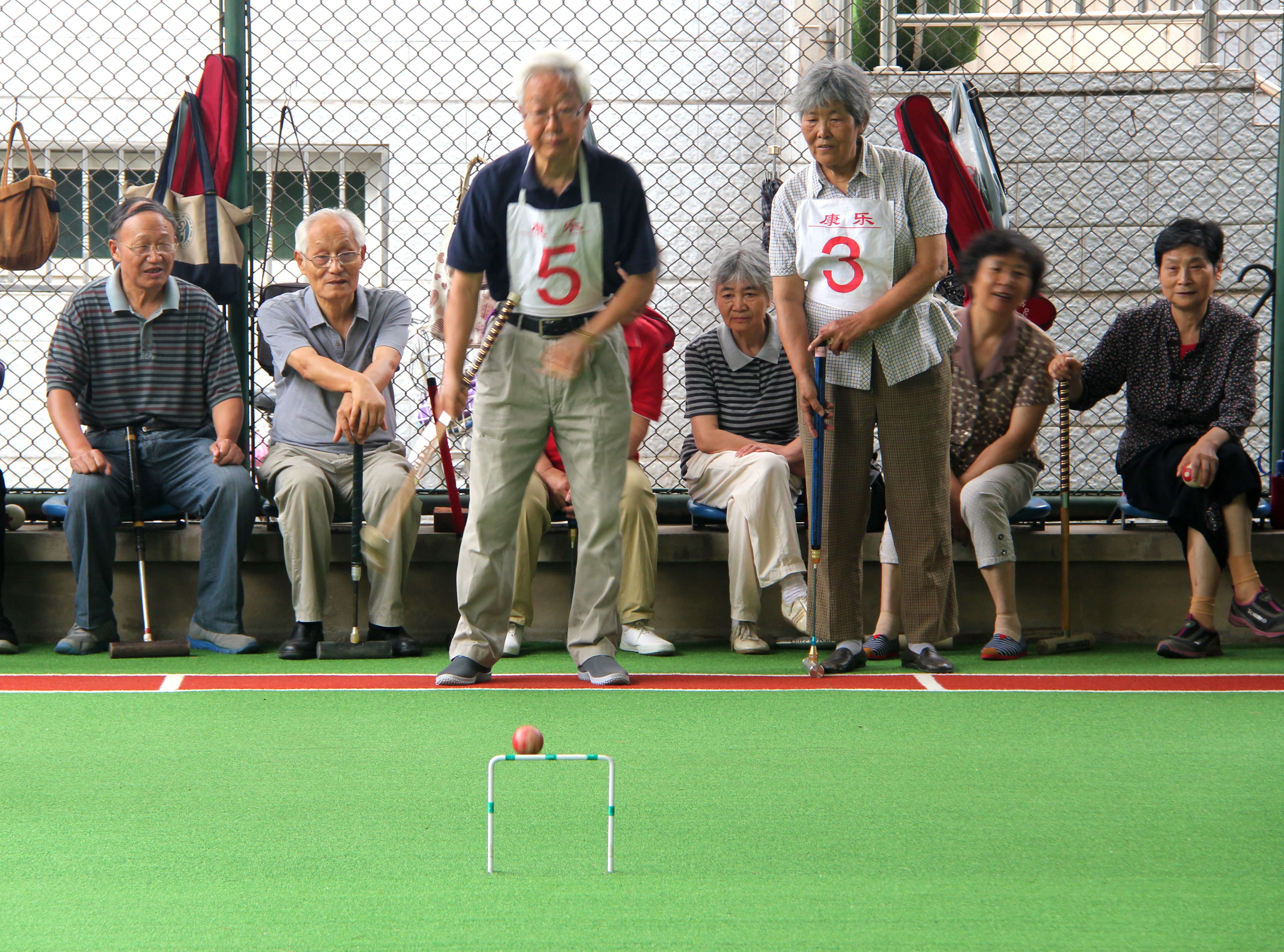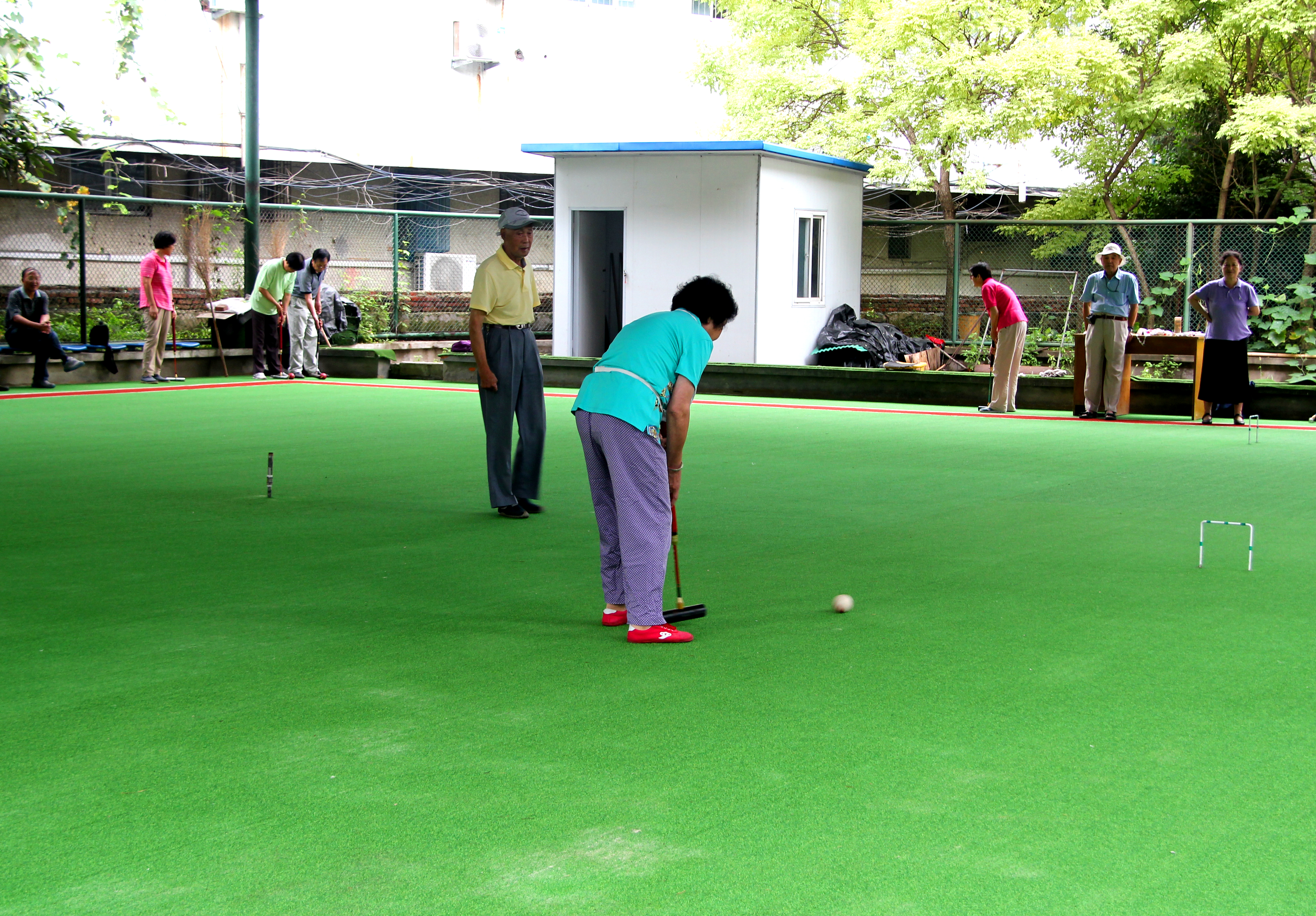 在我校老干部40天的门球初级培训班结束之际,7月18日,科大离退办和老年体协在东区门球场,上午举办了第五届运动会门球团体赛,下午举办门球初级培训班学员5人对抗演练交流活动。