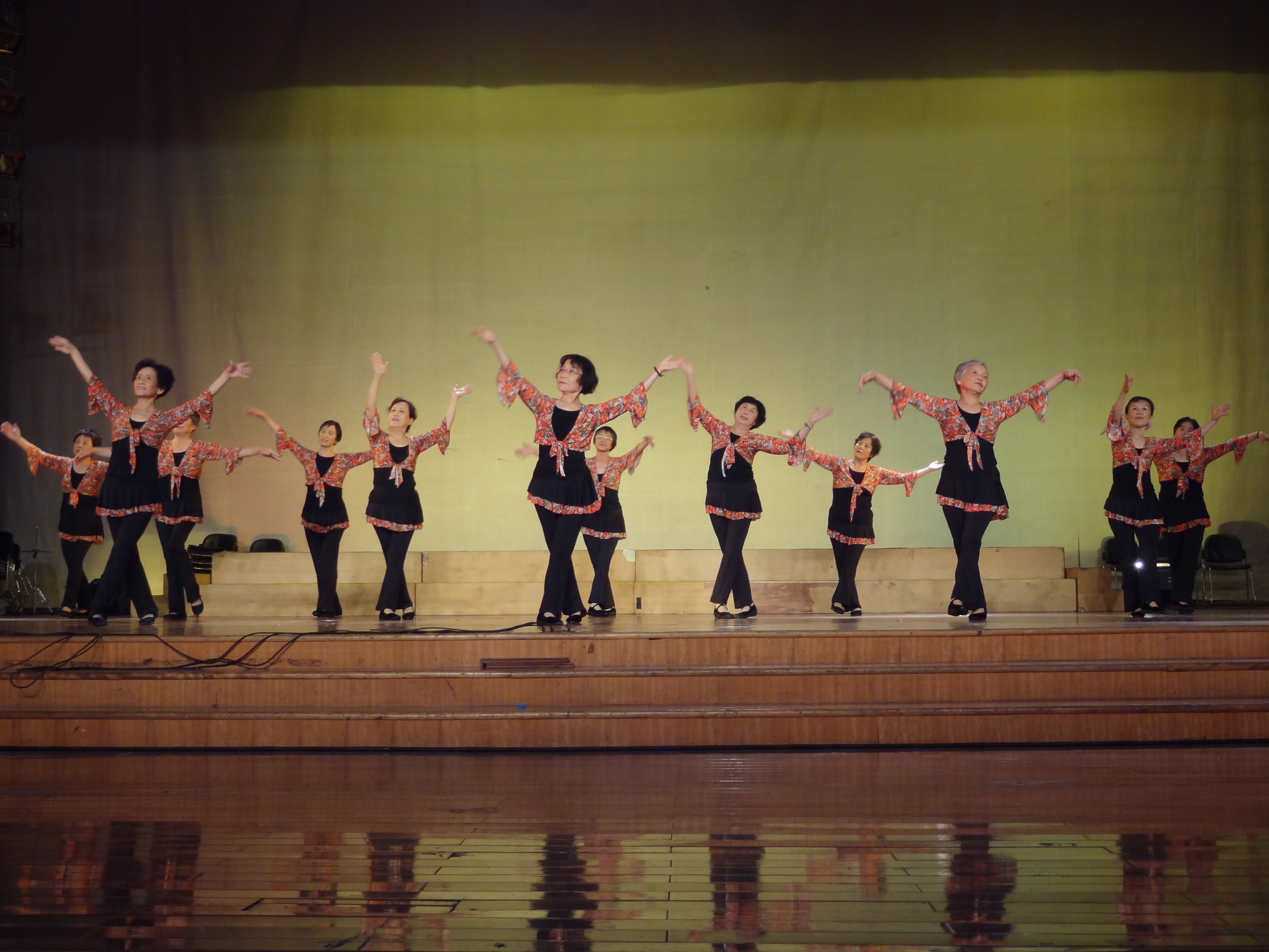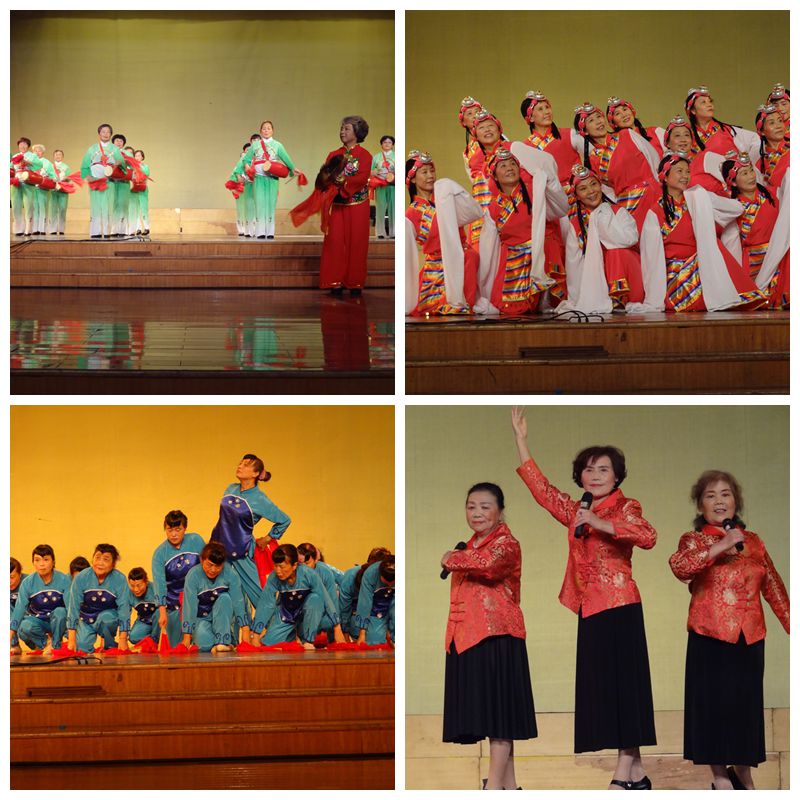 在文体活动中女同胞更显风采。平日里近百人坚持舞蹈、腰鼓锻炼。这次她们演出了花样腰鼓和四个舞蹈节目,台上婀娜的舞姿、曼妙的身段,甚至劈叉、腾跃等高难动作,引起观众啧啧称道。舞蹈《映山红》和《心声》等在伴奏曲目以及编舞思路中融入革命内容,表现了人民群众对美好生活的不懈追求和向往。现代京剧《江姐》选段《红岩上红梅开》以及黄梅戏《黄梅歌声天下扬》都展现出女同胞热爱生活、积极向上的精神风貌。金秋艺术团合唱队即将参加安徽省首届老年文化艺术节,为此排练了三首艺术歌曲,也在这次联欢会上演出。