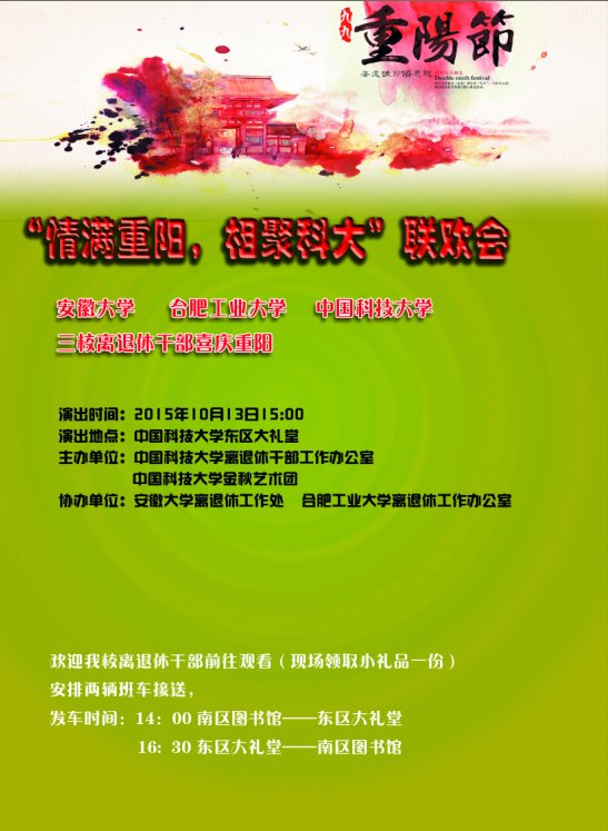 “岁岁重阳,今又重阳。”在这个尊老,爱老,敬老传统的节日即将来临之际,我校离退办、金秋艺术团特邀请安徽大学、合肥工业大学共同组织举办“情满重阳 相聚科大”三校离退休干部联欢会。