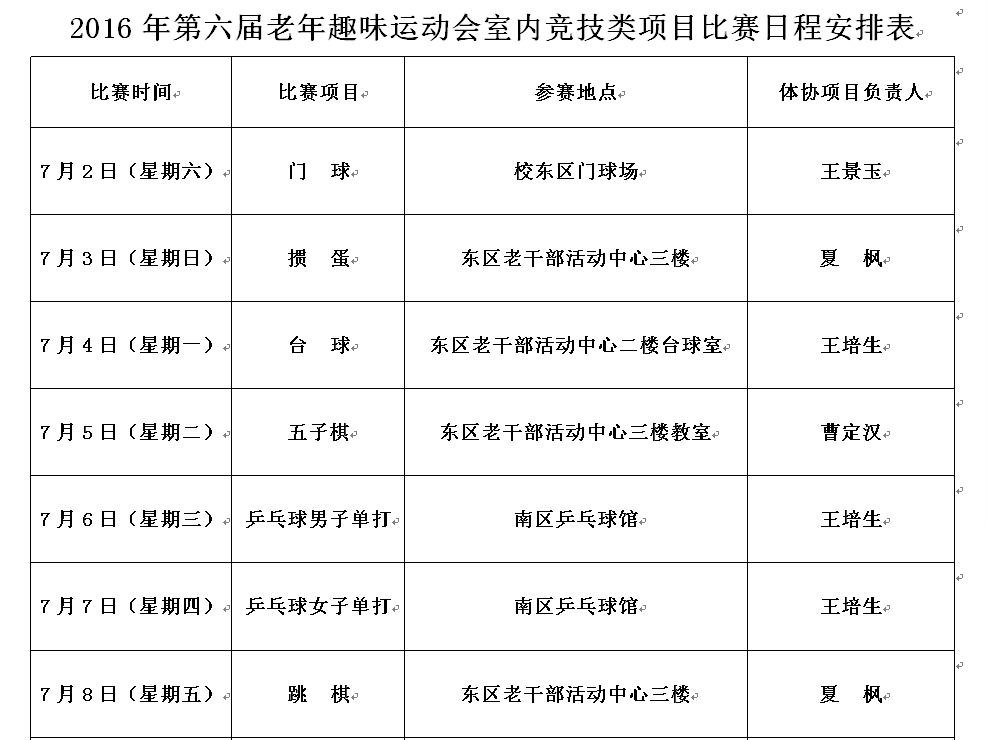 竞技类项目,凡参赛者直接至东区离退办闫咏梅老师处和南区离退办陶炜老师处报名。