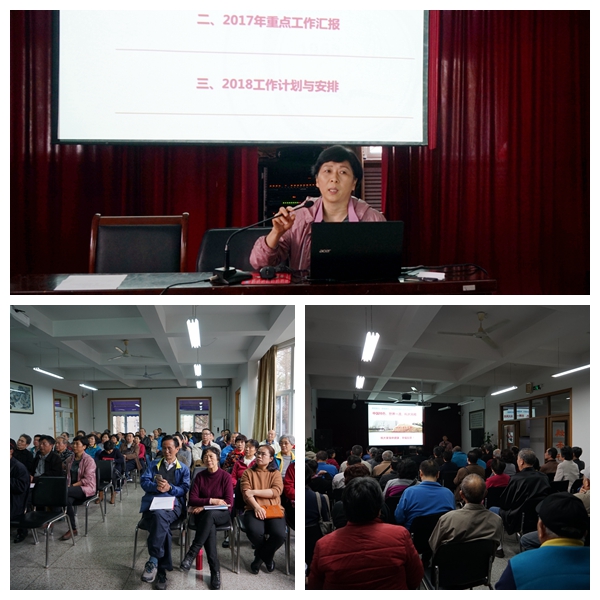 首先,校离退办主任刘艳分别从离退休干部人员概况、2017年离退休干部工作总结、2018年工作计划与安排等三方面进行了汇报。截止到目前,我校有1767位离退休干部,80岁以上近300人,70岁以上近1000人,呈现出高龄人员多、空巢老人多等特点。这也是我们开展工作的重点和难点所在。2017年,我办围绕党建活动、文体活动、福利慰问帮扶、保健体检等方面扎实推进工作。在党建方面,以支部与管理片为抓手,强化政治引导,组织集中学习和参观考察,合理调整支部设置,充分发挥骨干作用,不断加强基层党支部建设工作;在文体活动方面,充分发挥老年大学、金秋艺术团、老年体协、老年科协、关工委等平台的作用,全年围绕不同主题组织了6到8次大型文体活动,使老同志老有所乐、老有所为;在福利慰问帮扶方面,认真落实老同志的“生活待遇”,全年慰问生病住院老同志达到400人次,让老同志倍感温暖,等等。2018年,我办将围绕校庆60周年安排全年工作,积极引导老同志参与、开展正能量活动,展示积极向上的精神风貌。