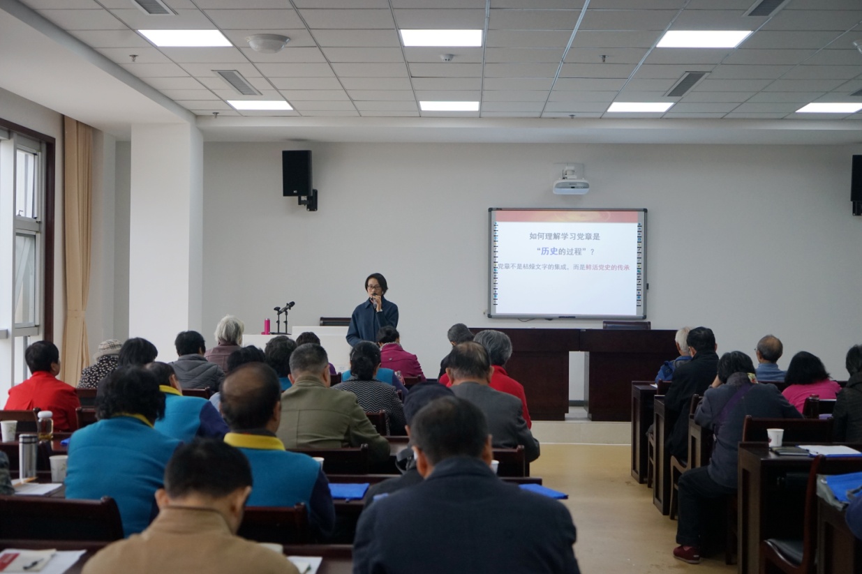 然后,省委党校吴梅芳教授用两个小时的时间为大家上了一堂生动的党课。她以党章背后的故事为切入点,声情并茂地介绍了从党的“一大”到“十九大”97年来党章的建设历程。吴教授详细介绍了十九大党章修正的主要特点和主要原则,分析了党章的体例和逻辑结构,着重阐述了十九大党章的修改内容及深刻内涵,主题鲜明,条分缕析,详细缜密。她指出,党章是党的总章程,对加强党的领导和建设具有根本性规范和指导作用。学习党章既是“历史的过程”,也是“立体的过程”。党章不是枯燥的文字,而是鲜活党史的传承,浓缩了党的历史经验和与时俱进的理论品质,字字珠玑,章章重要。在场的老同志们被如此生动的党课牢牢吸引,收获颇多。