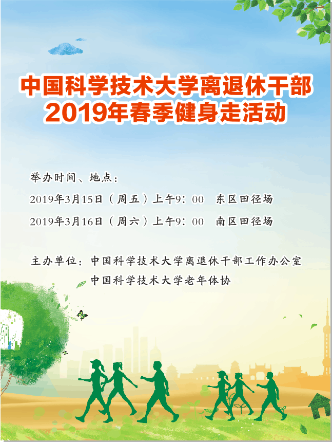 为培养离退休教职工的健康意识,倡导健康文明的生活方式,营造积极向上的校园文化,中国科大离退办、中国科大老年体协于3月15日、16日上午分别在东区运动场、南区运动场举办2019年春季健身走活动,欢迎各位老师踊跃参加!