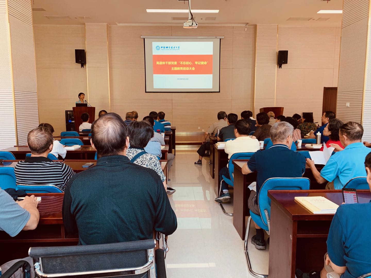 2019年9月19日上午,离退休干部党委在南区图书馆一楼老年大学教室举行“不忘初心、牢记使命”主题教育启动会,各离退休干部党支部书记、支委及行政片片长、离退休干部工作处全体党员参加会议。会议由离退休干部党委书记刘艳主持。