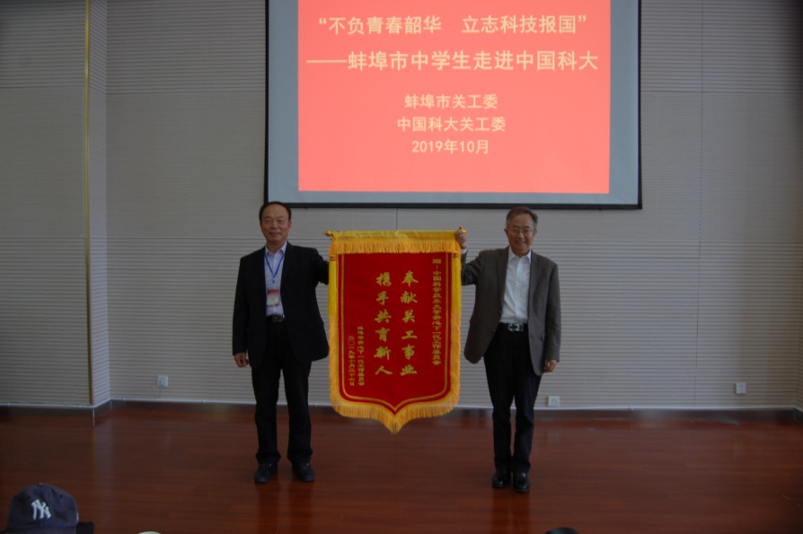 关工委副主任周先意教授代表学校向蚌埠市师生的到来表示热烈欢迎,并感谢各级关工委对中国科大的信任,选择中国科大作为蚌埠市优秀中学生的研学活动点。希望通过今天的活动,能为孩子们搭建一个开拓视野、丰富知识的平台,了解大学、了解大学精神、了解大学中的大家,走进科技的前沿,在孩子们的心中种下科学的种子。蚌埠市关工委第二主任徐超向我校赠送了“奉献关工事业 携手共育新人”的锦旗。