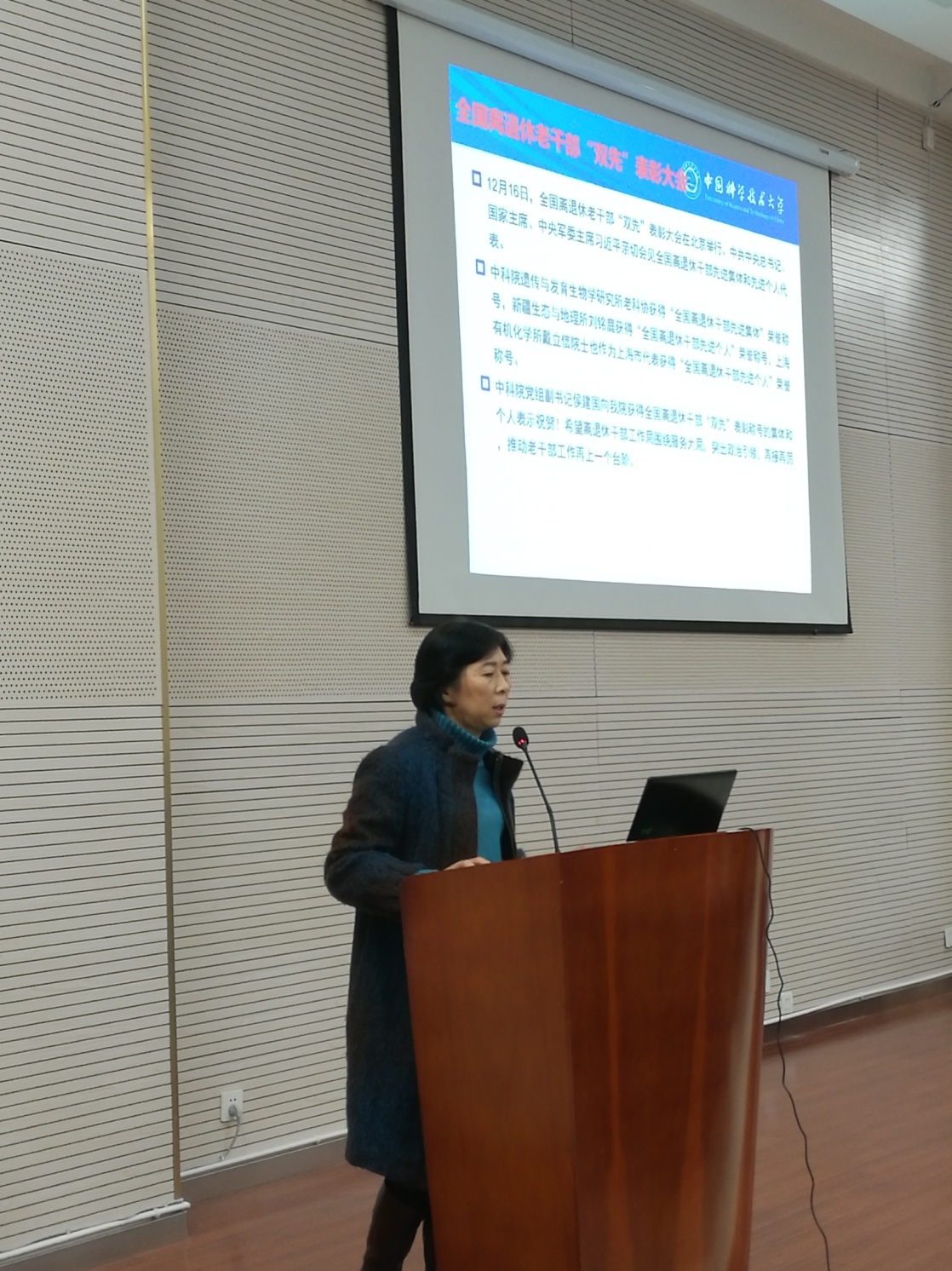 会上,刘艳首先向大家介绍了我院获得全国离退休干部“双先”表彰称号的集体和个人,传达学习全国离退休干部“双先”表彰大会、全国老干部局长会议精神,以及中科院党组副书记侯建国针对院离退休工作提出的希望和下一步具体要求。