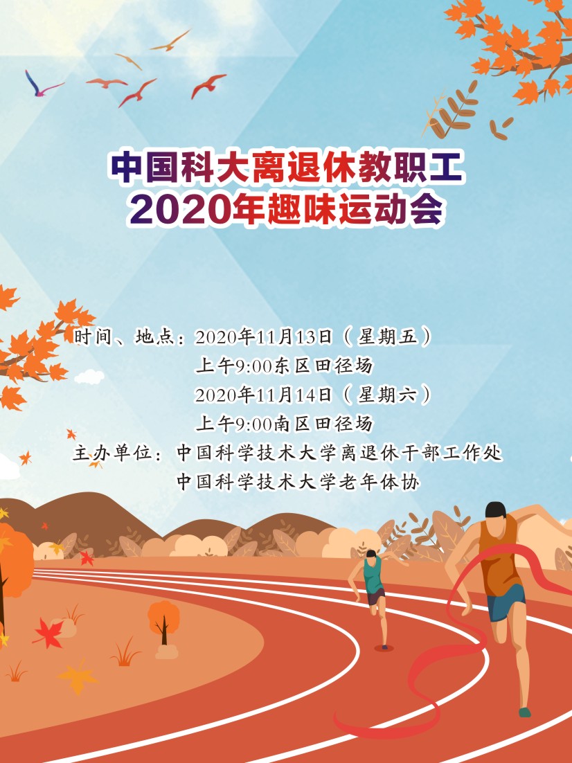 为贯彻落实全民健身纲要,激发广大离退休教职工参与体育锻炼的主动性和积极性,丰富校园文化生活。现定于11月13日上午9点、11月14日上午9点分别在东区田径场、南区田径场举办趣味运动会,欢迎各位老师踊跃参加!