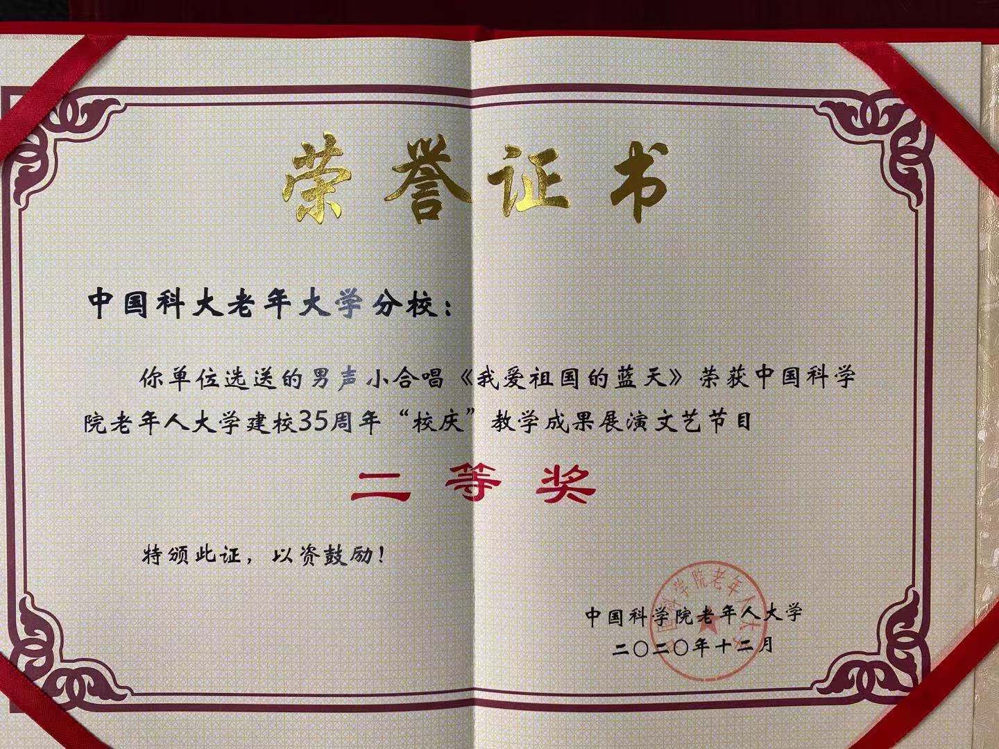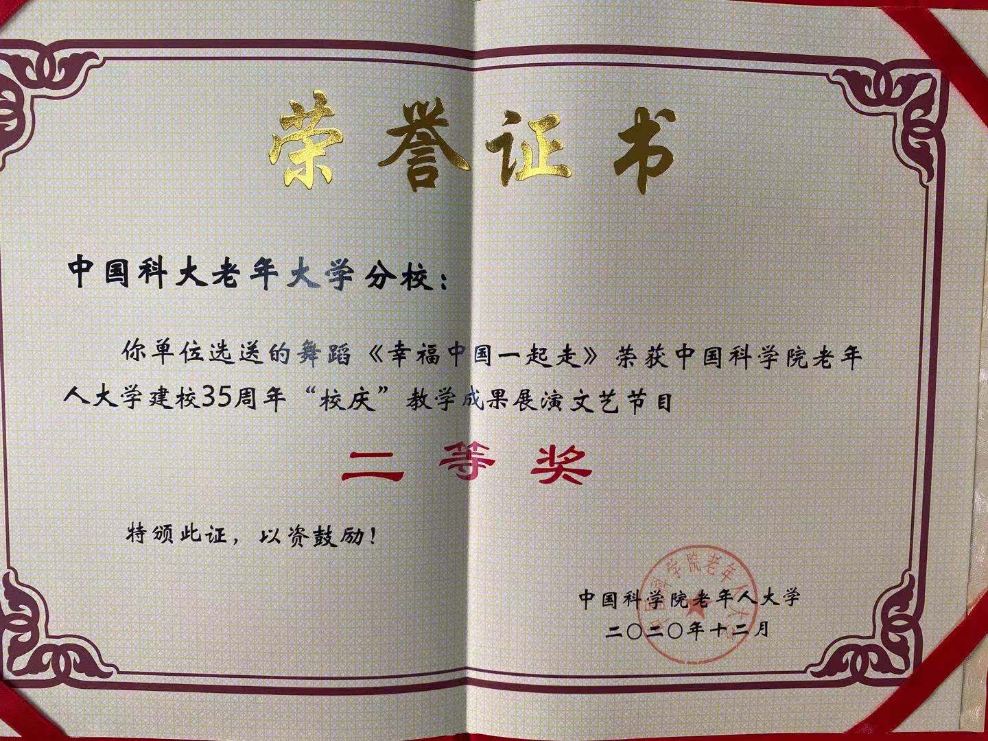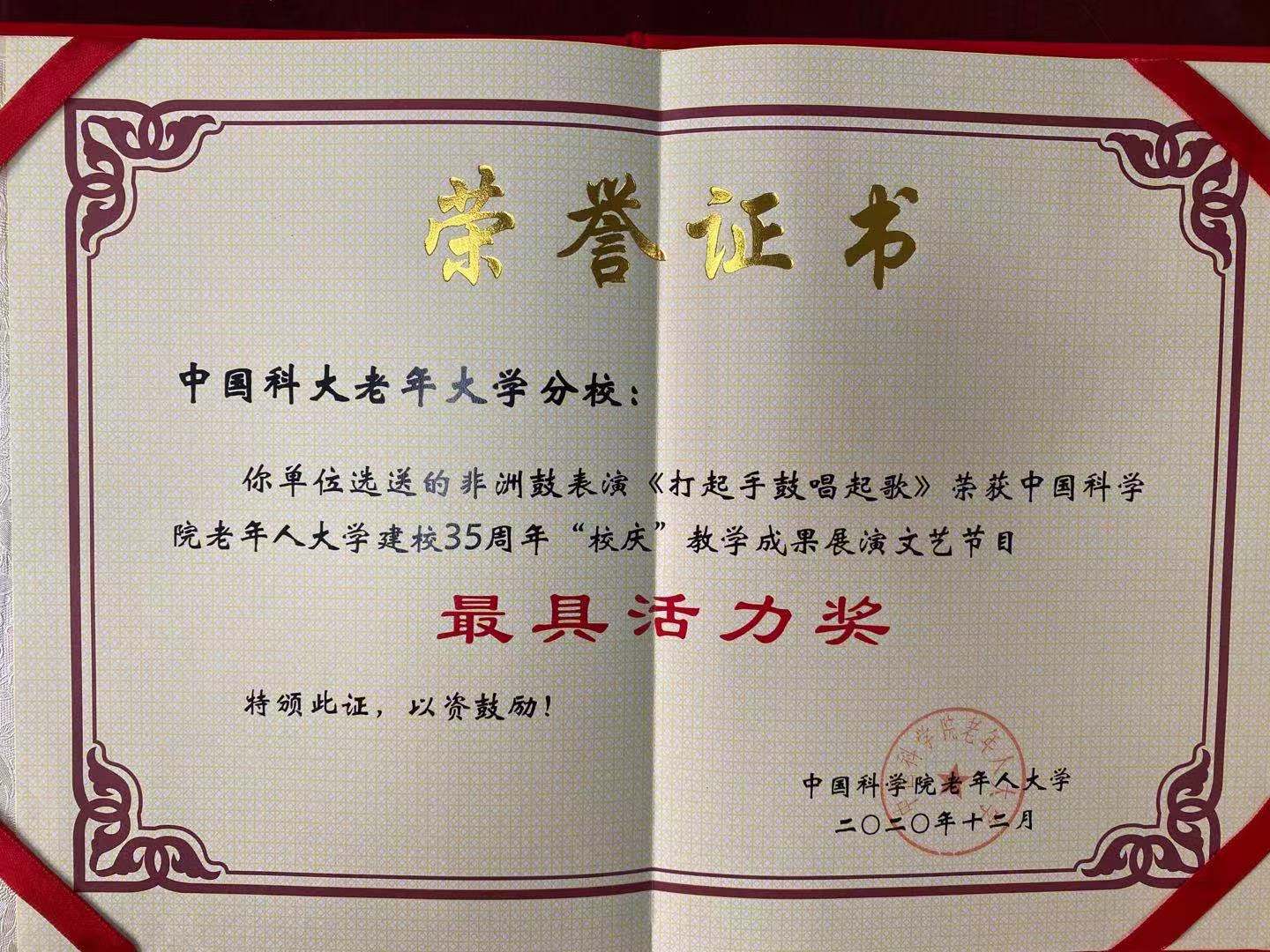 经过院老年大学评选,我校老年大学获院老年人大学35周年校庆活动优秀组织奖,我校男声小合唱《我爱祖国的蓝天》、舞蹈《幸福中国一起走》获院老年人大学35周年校庆展演文艺节目二等奖,非洲鼓表演《打起手鼓唱起歌》获最具活力奖。