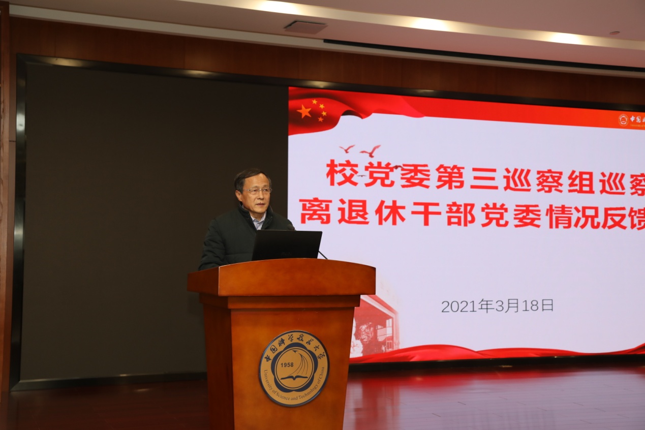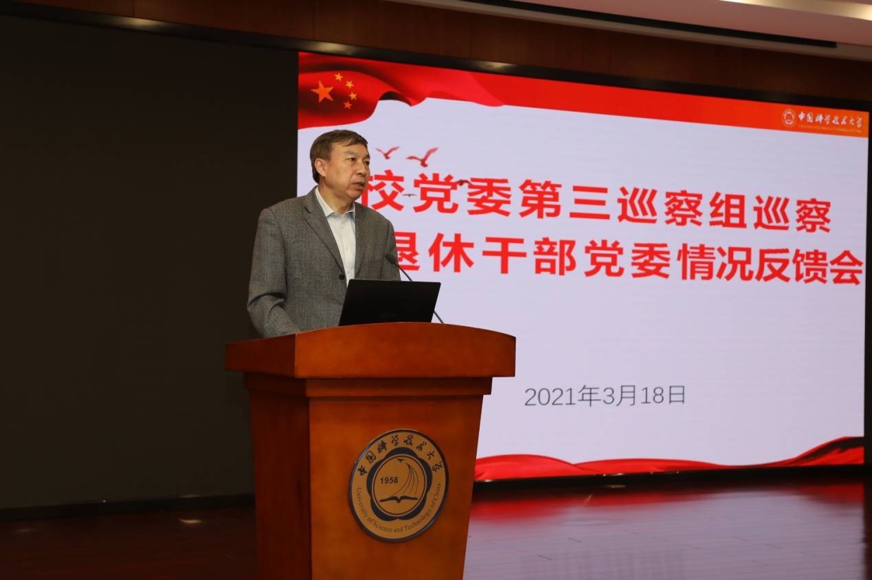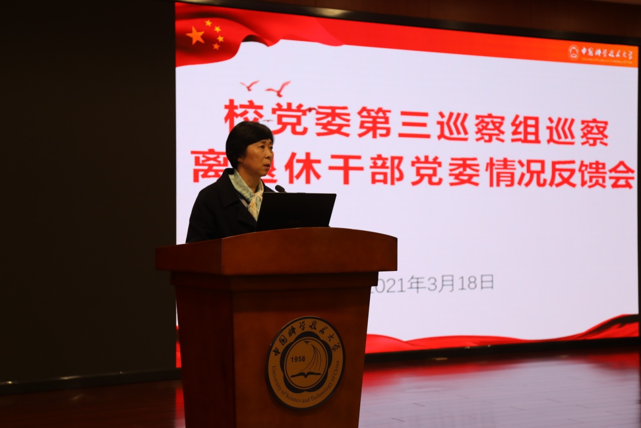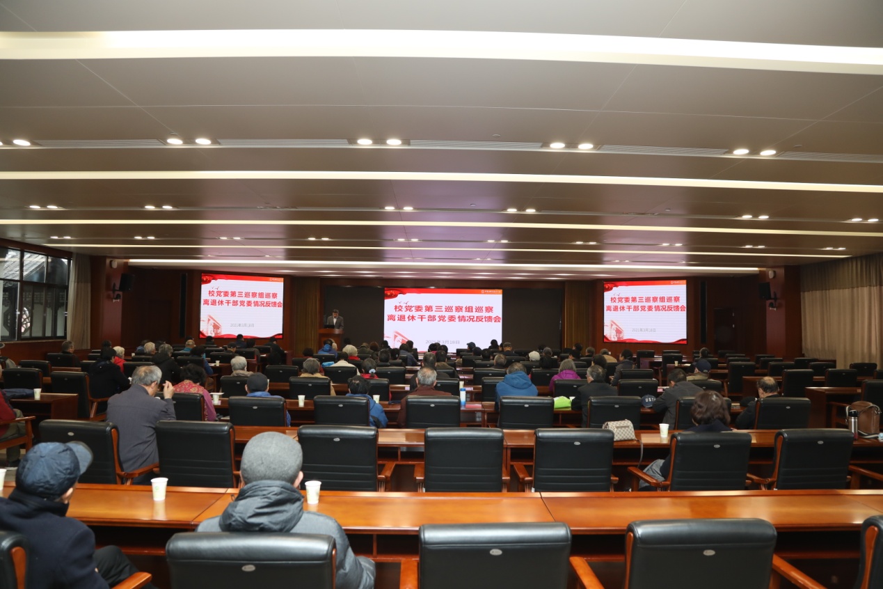 葛学武代表巡察组反馈了巡察情况。整体上看,离退休干部党委领导班子团结协作,认真贯彻落实中央和上级单位有关文件精神,充分利用“五大活动平台”开展丰富多彩的文体活动,认真开展党内关怀帮扶慰问,各项工作取得积极进展。但巡察发现:离退休干部党委在学习教育、制度建设、意识形态等方面存在不足;党建工作责任制落实不到位,在工作人员党支部规范化建设、党支部书记培训和考核等方面存在薄弱环节。离退休干部党委要建立健全党委理论学习中心组学习制度,加强领导班子自身建设,创新工作举措,搭建工作平台,为离退休人员做好服务,充分发挥离退休人员自身优势,为推动学校发展作出更大的贡献。