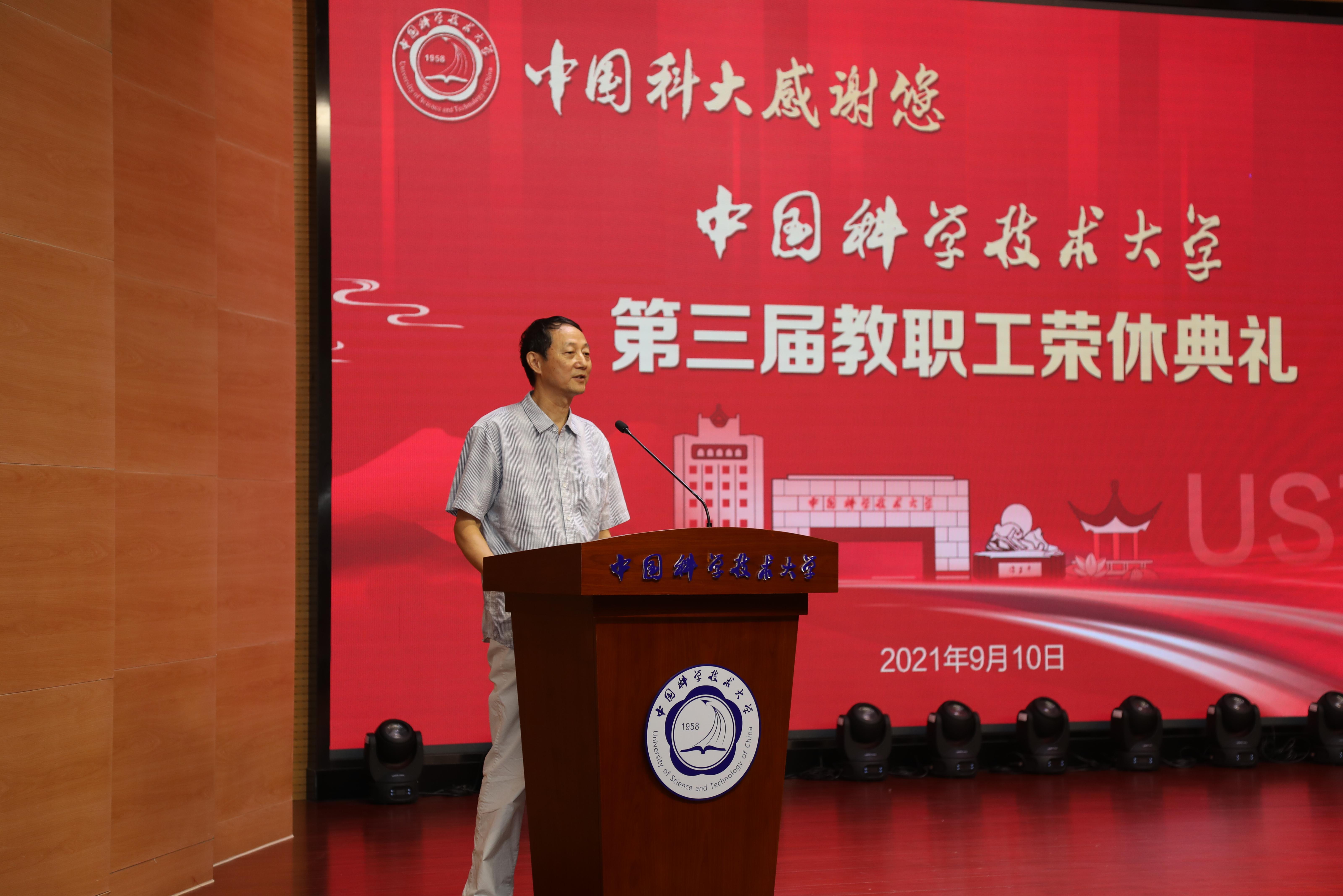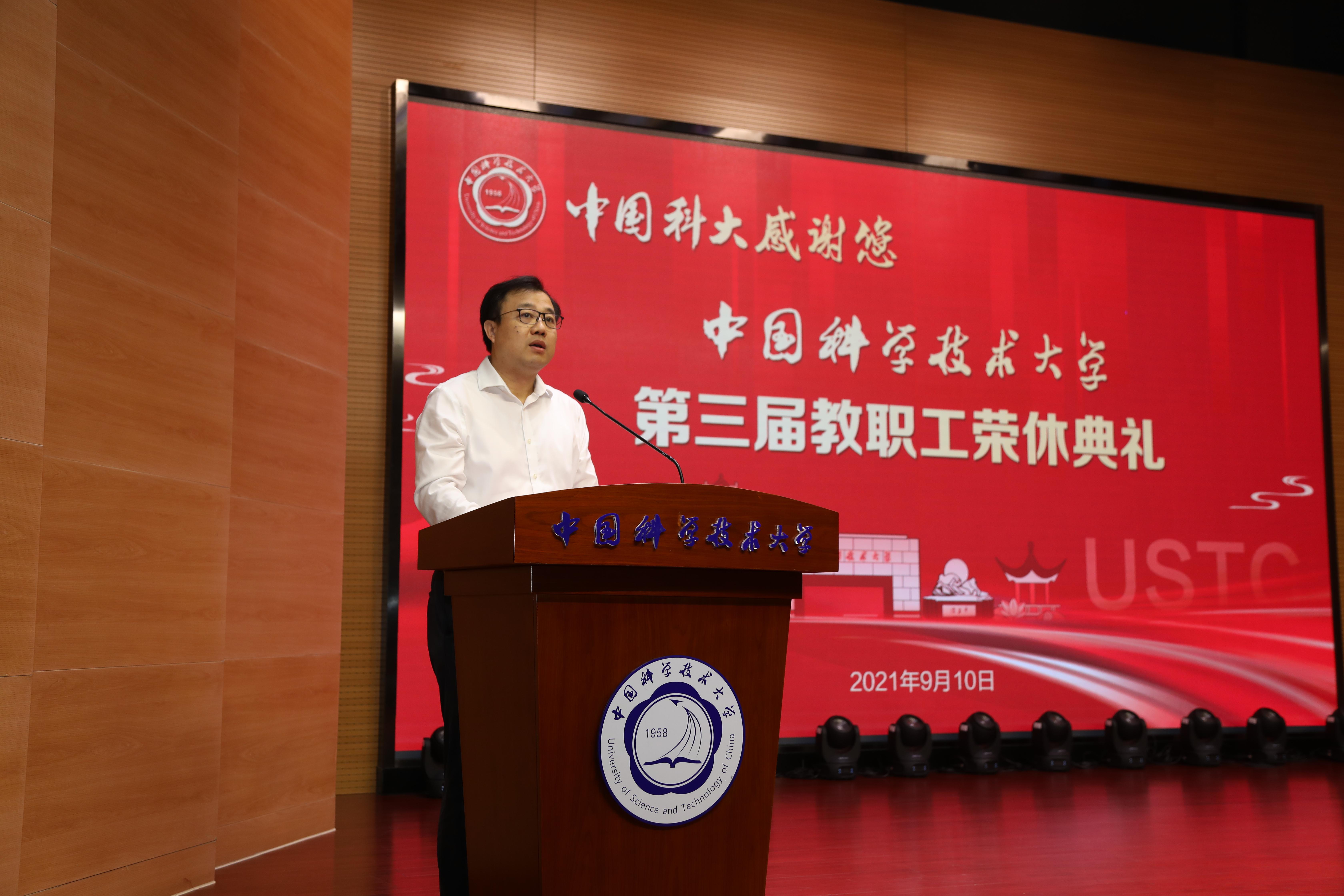 校党委书记舒歌群代表学校向全体教职工致以节日的问候,向2020年度光荣退休的60名教职工致以崇高敬意和衷心感谢。他说,今日科大之成就,源自大家昔日的辛勤与努力。学校会感恩、会铭记在这里奋斗过、拼搏过、奉献过的每一位教职工。习近平总书记指出“一个人遇到好老师是人生的幸运,一个学校拥有好老师是学校的光荣,一个民族源源不断涌现出一批又一批好老师则是民族的希望”。荣休老师们不仅是好老师,更是中国科大的光荣,是中国科大的骄傲。