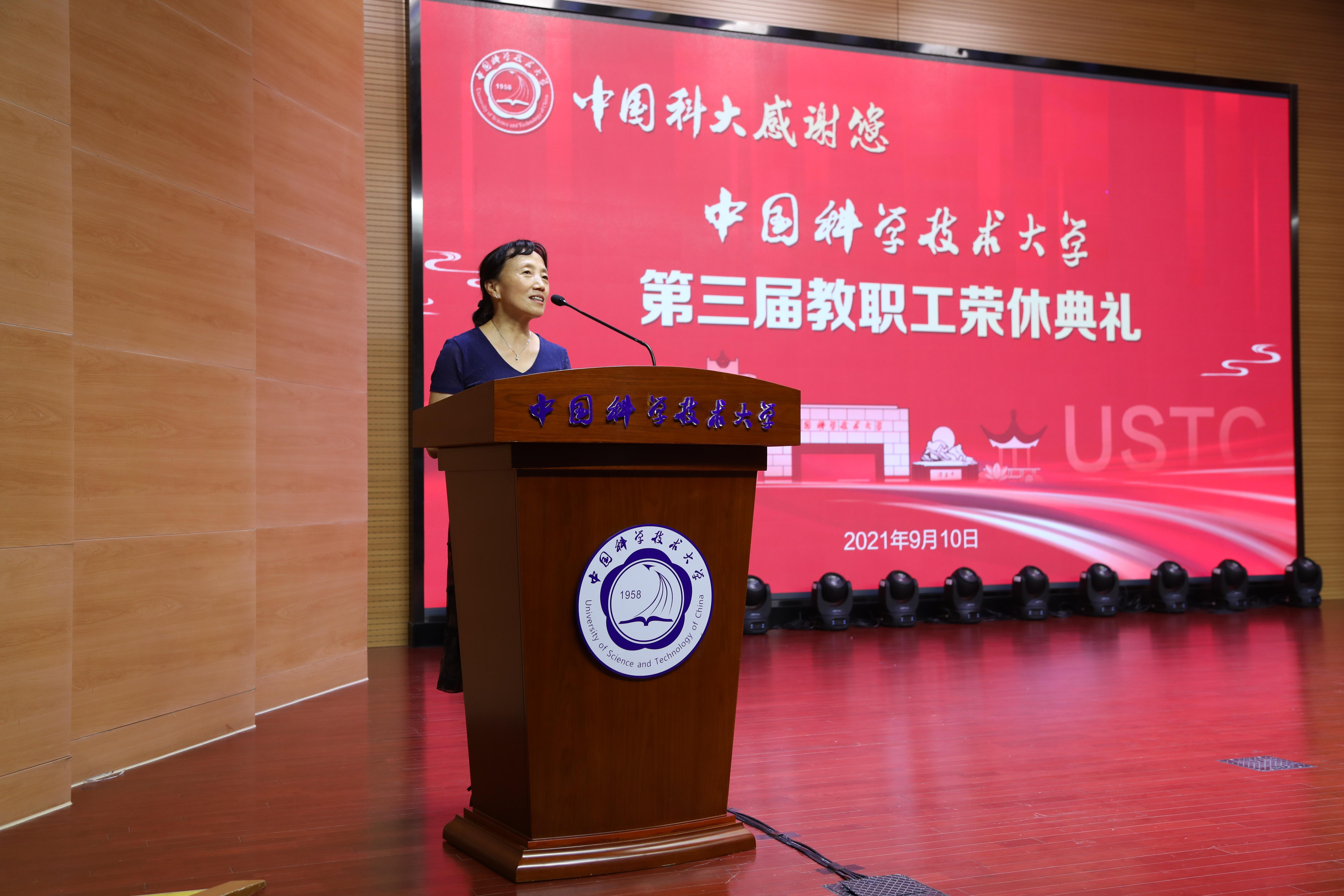 典礼上,荣休教职工代表发言。生命科学与医学部丁丽俐老师深情回顾了自己在科大学习工作的经历,对学校表示感谢。她说,多年来,学校及时满足师生需求、积极提供学习机会、处处充满人文关怀。退休后,将继续关注学校各项改革发展,积极发挥余热。