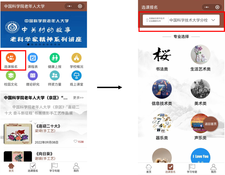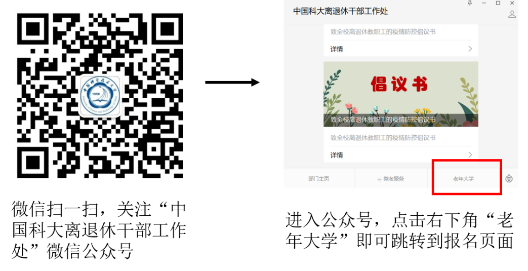 方式1:微信关注“中国科大离退休干部工作处”或“书馨科院”微信公众号,点击“老年大学”即可跳转到报名页面。