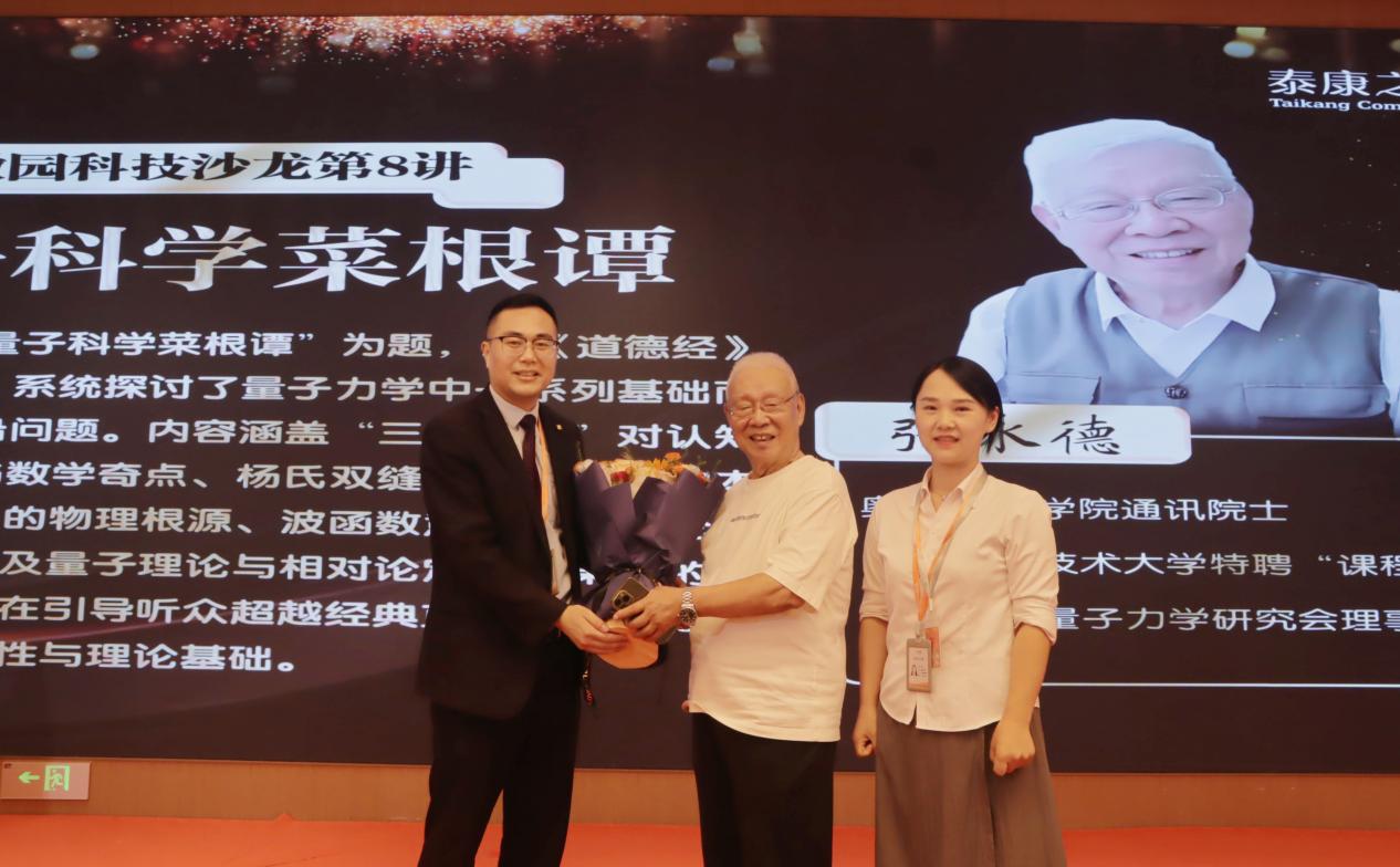 整场报告不仅是一次知识的传递,更引发了热烈的互动交流。现场居民踊跃提问,围绕“量子纠缠是否像双胞胎心灵感应”“量子计算机原理”“灵魂能否用量子解释”等话题与张教授深入探讨,跨越年龄与专业界限的思想碰撞让现场氛围格外活跃。报告结束后,泰康之家徽园社区负责人苏长亮向张永德教授献上鲜花,衷心感谢他为社区带来前沿科学视野,用智慧点亮居民的好奇心,充分契合了徽园“邻里共享、价值共创”的温暖内核。