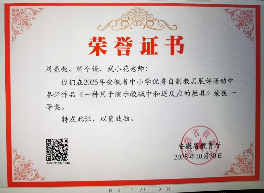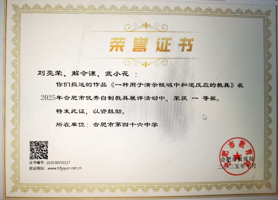 我校老科学家报告团成员,原中国科大附中副校长,安徽省著名中学化学特级教师曹锦群带领合肥市第46中学刘亮荣、解令谦等老师研制的教具“一种用于演示酸碱中和逆反应的教具”荣获省一等奖。此自制教具还在此前合肥市举办的自制教具展评中荣获市一等奖。