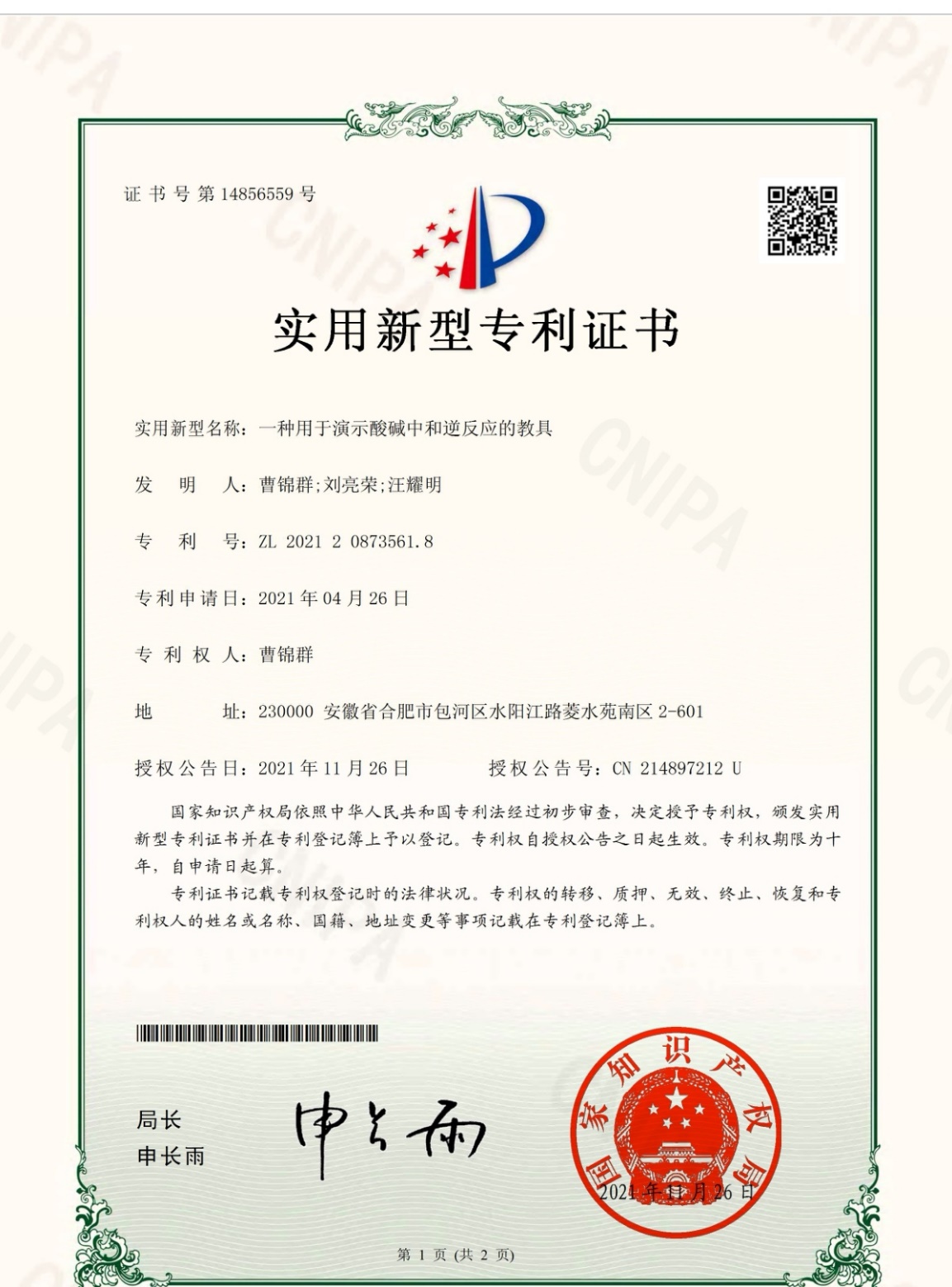 该自制教具在两年前获得国家实用新型发明专利证书,是一件凝聚曹锦群教师团队智慧和心血的原创作品。它利用生活中常见的不锈钢管材、家庭养鱼用的小型水循环泵、中学实验室学生电源、学生美术课常用的素描双头画夹、市场上已广泛应用的双极膜等材料巧妙组合成“一种用于演示酸碱中和逆反应的教具”。该教具携带使用方便,将温度传感器、导电率检测仪、pH检测仪等多种现代化数字传感技术与双极膜完美结合,解决了现行中学化学课堂的传统实验只能演示酸碱中和正反应,不能同步演示酸碱中和逆反应的难题。该教具在教学中为学生创设更丰富科学的实验情境,通过直观清晰的实验现象和数字化曲线,让学生同步感受酸碱中和正反应和逆反应的探究过程,增强学生对科学知识的情感认识和探究性体验,培养学生的证据推理和模型认知等化学学科核心素养,提高学生分析问题和解决问题的能力,提升中学化学实验教学水平和育人效果。